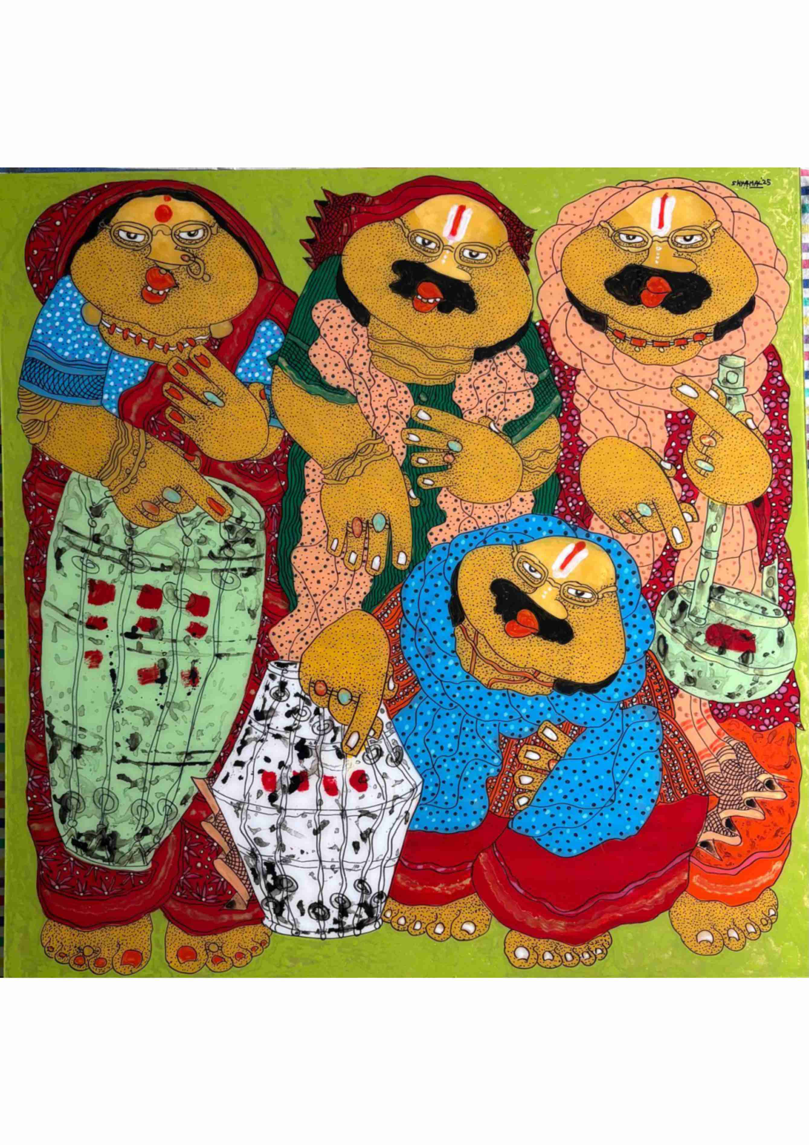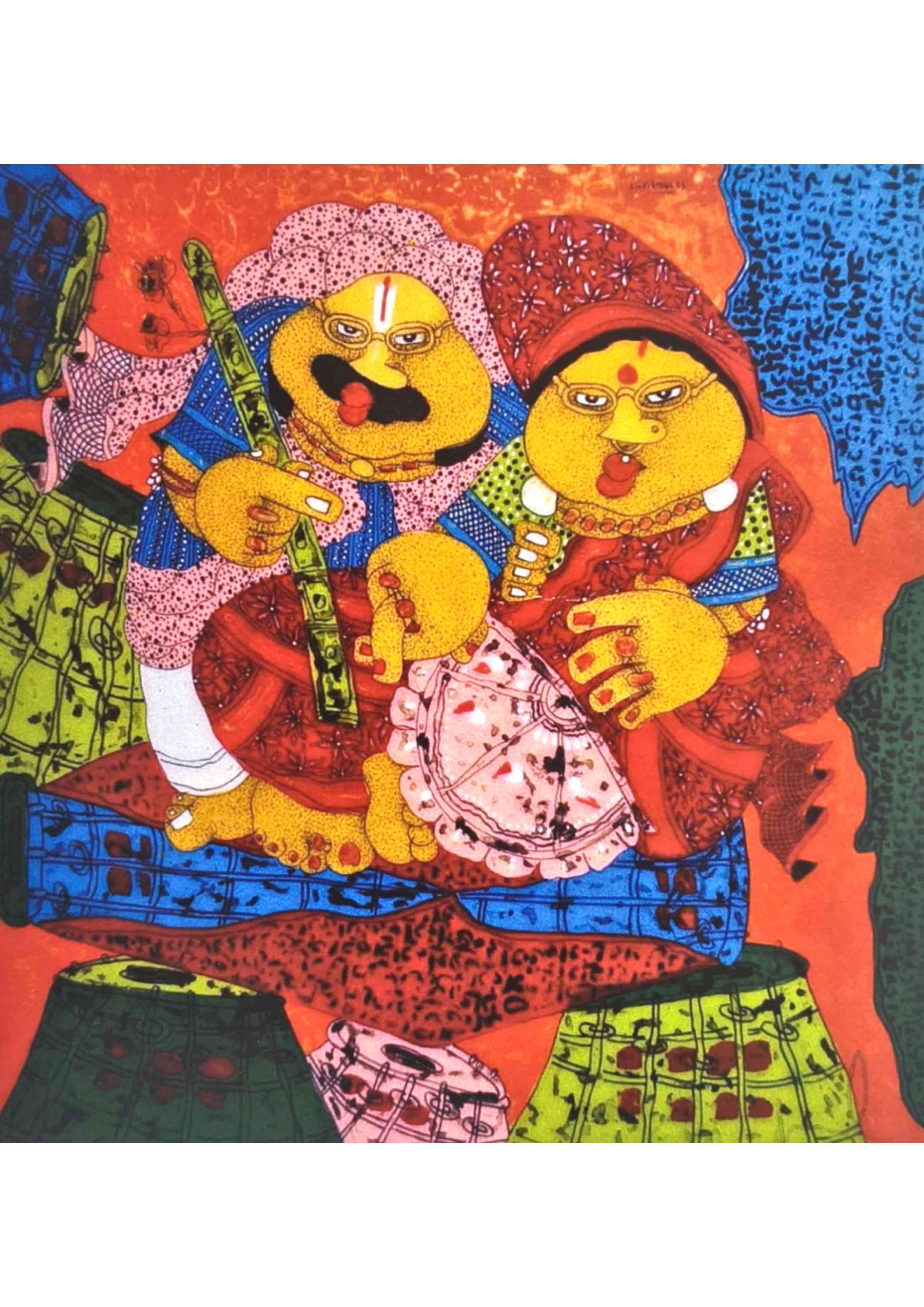 His paintings are instantly recognizable for their bold colours, rounded forms, and narrative charm. Through recurring characters such as Baba and Bibi, he explores themes of relationships, simplicity, and emotional depth, often revealing profound truths through lighthearted and humorous compositions.